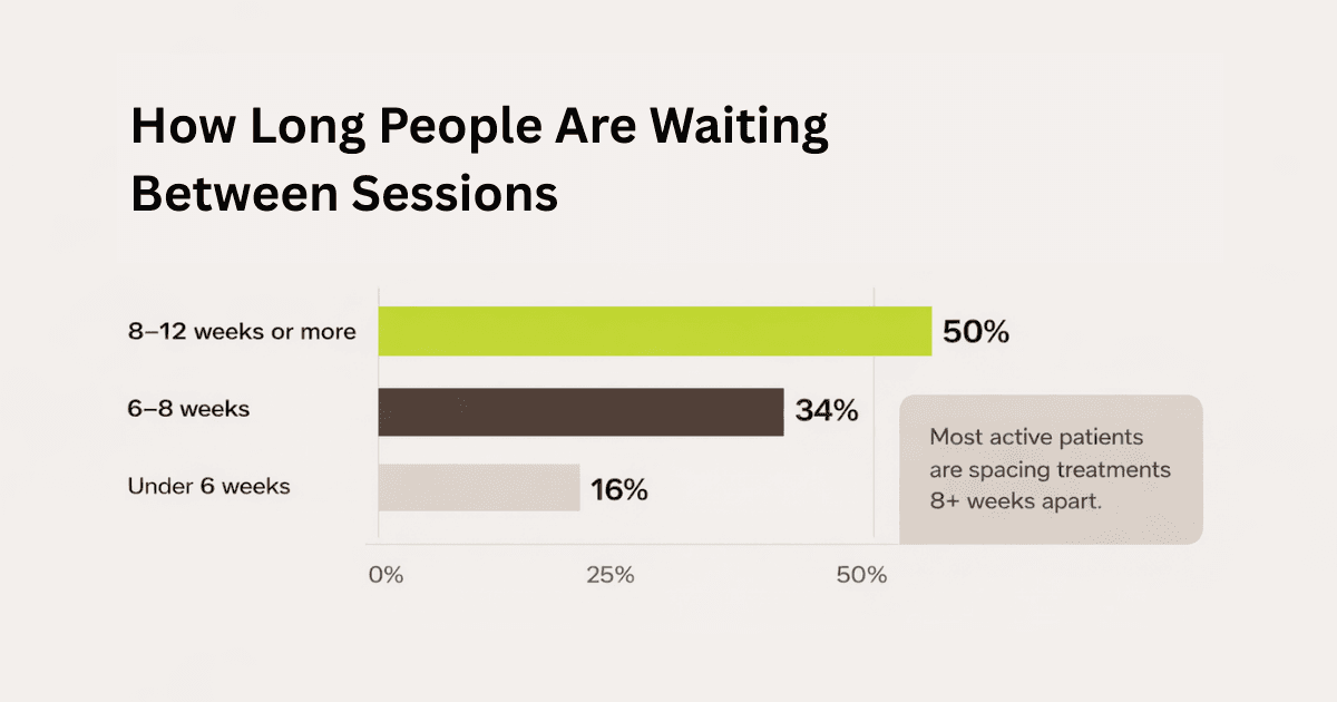A large portion of users are choosing to wait 8+ weeks between sessions. This may reflect clinic guidance, personal healing preferences, or budget timing… but it’s clear that shorter intervals (under 6 weeks) are much less common among active patients.